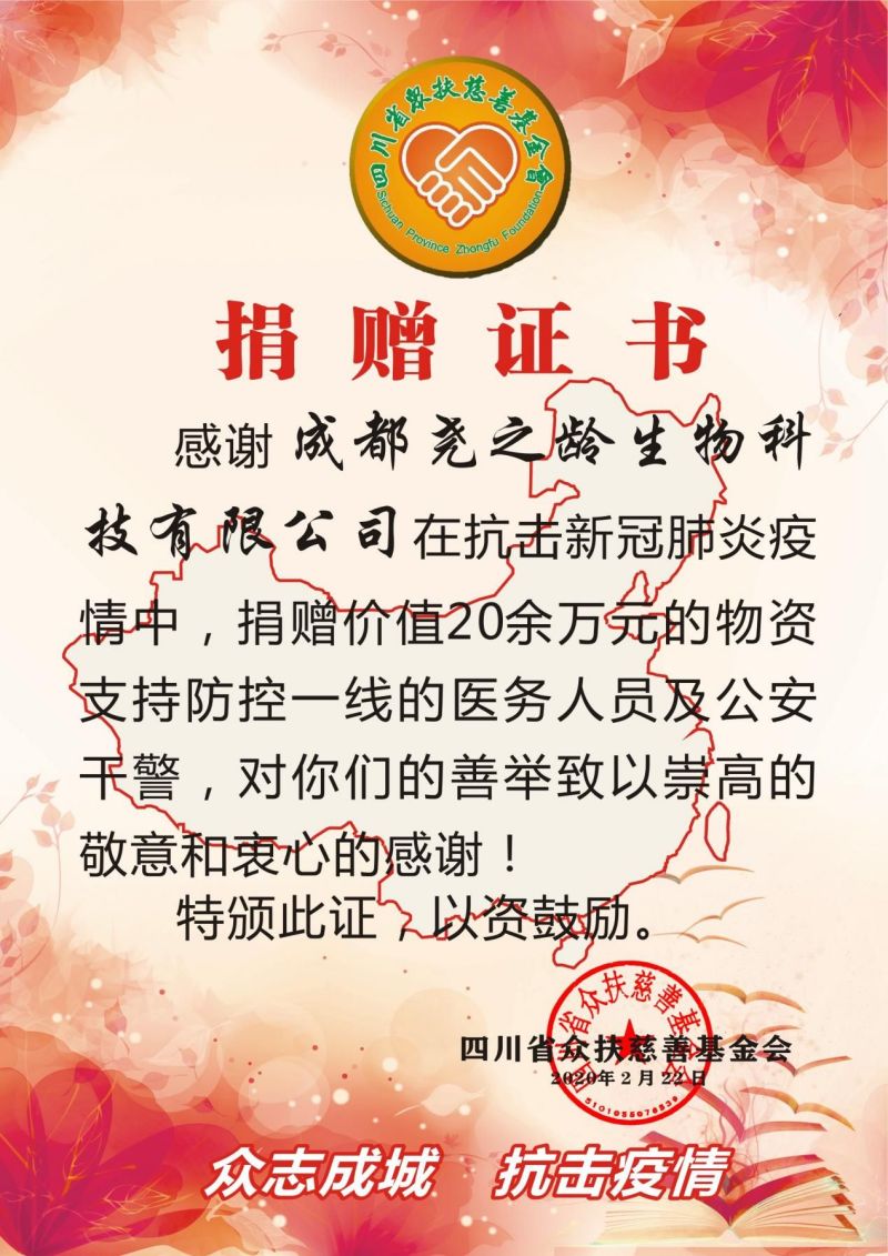 岂曰无衣,与子同袍。为协助对抗新冠肺炎疫情,成都尧之龄生物科技有限公司秉持“一方有难,八方驰援”、“多一家企业出一份力,社会上就能多一份力量”的理念投入到支援疫情洪流中,在力所能及的范围内尽企业的社会责任,捐赠价值20余万元的物资支持防控一线的医务人员与公安干警。